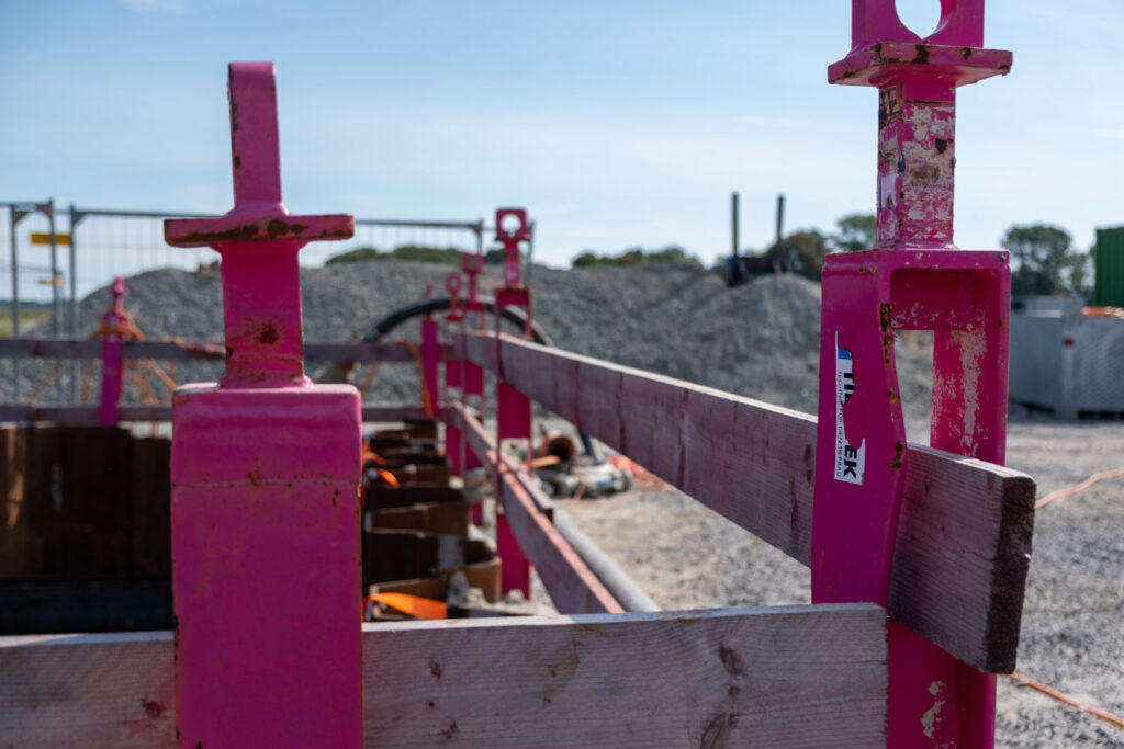 Zur Sicherung des Absturzbereiches an Baugruben oder Schächten ist die Absturzsicherung das ideale Produkt. Wir liefern eine Pfostenpalette bestückt mit 16 stabilen Stahlpfosten, die mittels Bagger entnommen und in den Boden eingedrückt werden. Als Geländer dienen Holzbohlen, die seitlich in die Stahlpfosten eingeschoben werden.